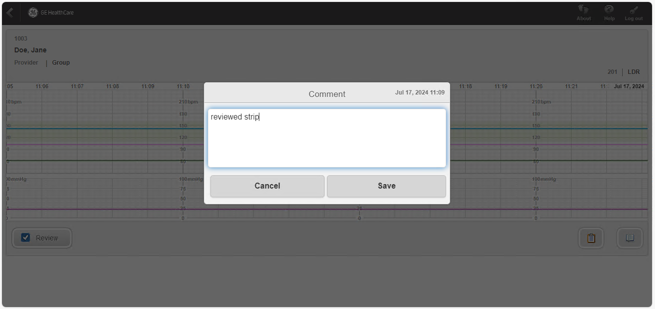 The Web Annotation Comment allows you to create a web annotation for any minute of a patient’s fetal monitor session that you have loaded in the Patient Details View. This annotation can then be seen in Centricity Perinatal Web as well as Centricity Perinatal and Centricity Perinatal - Connect.